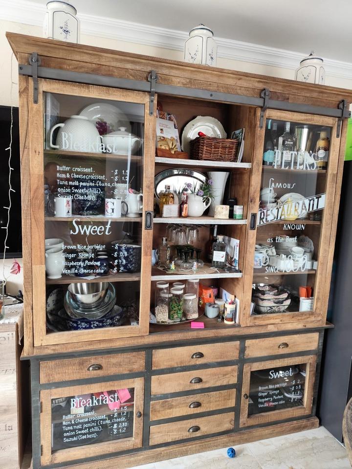 Wohnzimmer mit Couch, Vitrine, TV und dekorativen Elementen