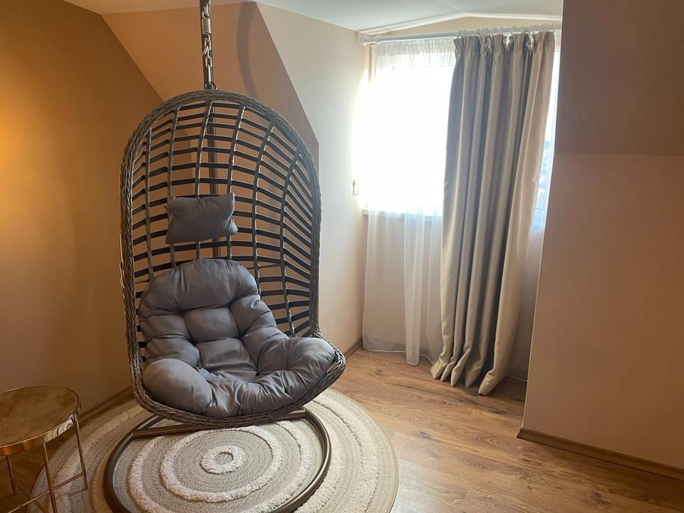 Vitrine, Deko, Tresen mit Tresenstühlen, Hängesessel, Lampen
