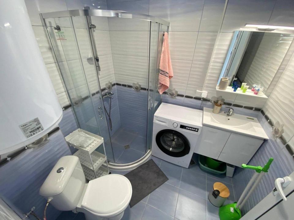 Badezimmer als Duschbad, ausgestattet mit Waschmaschine