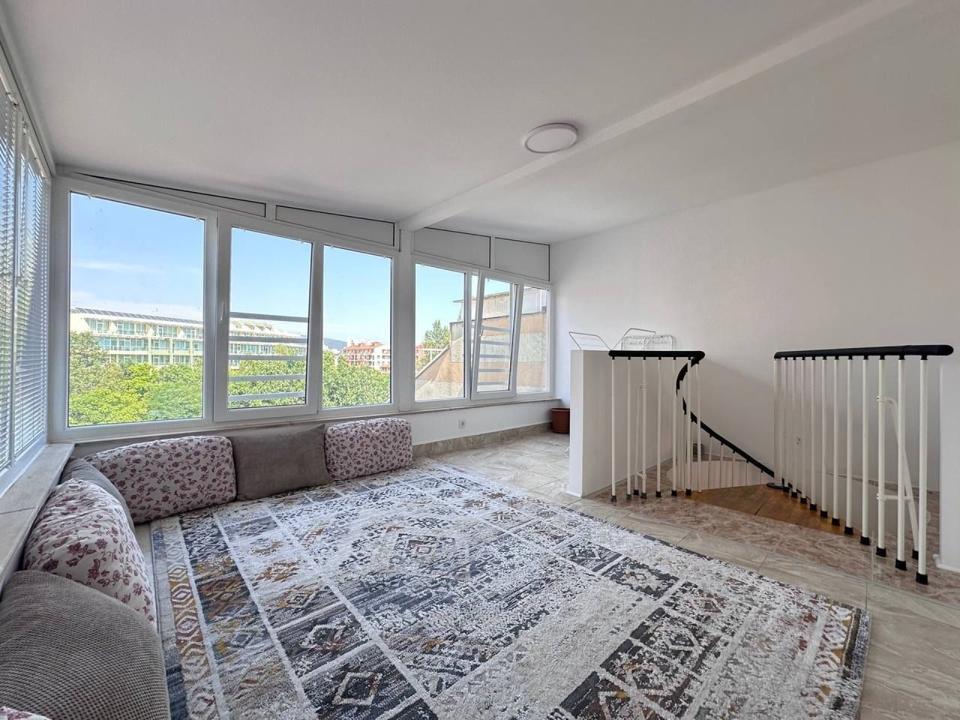 Wir bieten zum Verkauf eine geräumige Dreizimmer-Maisonettewohnung mit großer offener Terrasse an, gelegen im 4. Stock des gemütlichen Wohnkomplexes „Robinson“ in Sonnenstrand.