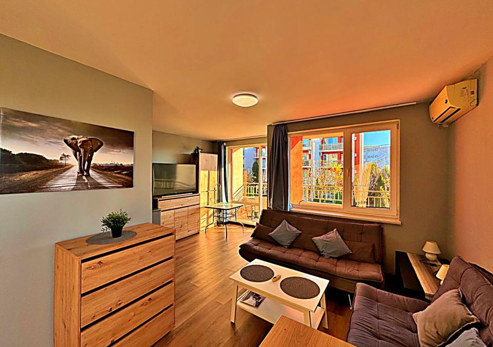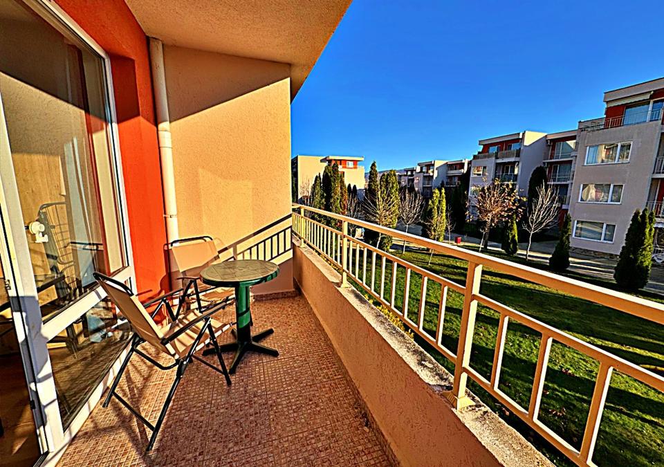 Wir bieten Ihnen ein geräumiges Studio im beliebten Nessebar Fort Club am Sonnenstrand (Sunny Beach), Bulgarien, zum Verkauf an. Die Wohnung verfügt über eine Wohnfläche von 54 m² und befindet sich in der 1. Etage von insgesamt 4 Etagen (ohne Aufzug). Der Balkon liegt im Hochparterre.