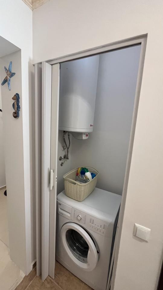 Die Wohnung besteht aus einem geräumigen Wohnzimmer mit Küche, separatem Schlafzimmer, Flur, Hauswirtschaftsraum mit Waschmaschine und Boiler, Badezimmer mit WC und einer großen Terrasse mit angenehmem Blick auf den Innenhof. Die Immobilie ist voll möbliert und ausgestattet mit Backofen, vier Kochplatten, Dunstabzugshaube, Kühlschrank, Waschmaschine, Fernseher und zwei Klimaanlagen – sofort bezugsfertig.