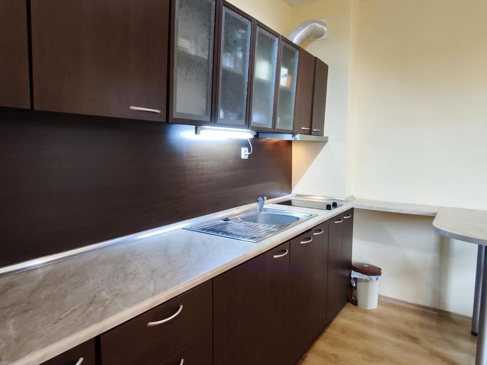 Die funktionale Küchennische ist mit allem ausgestattet, was Sie benötigen: moderne Küchenschränke, Kochfeld, Dunstabzugshaube, Spüle und Platz für einen Kühlschrank. Der Arbeitsbereich ist harmonisch in den Raum integriert und sorgt für ein offenes Raumgefühl.